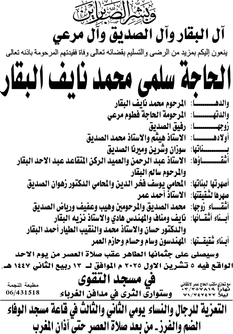 وفاة حماة الأستاذين يوسف فخر الدين وزهوان الصديق