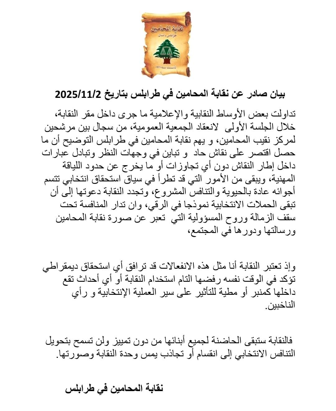 تداولت بعض الأوساط النقابية والإعلامية ما جرى داخل مقر النقابة، خلال الجلسة الأولى لانعقاد الجمعية العمومية، من سجال بين مرشحين لمركز نقيب المحامين، و يهم نقابة المحامين في طرابلس التوضيح أن ما حصل اقتصر على نقاش حاد و تباين في وجهات النظر وتبادل عبارات داخل إطار النقاش دون أي تجاوزات أو ما يخرج عن حدود اللياقة المهنية، ويبقى من الأمور التي قد تطرأ في سياق استحقاق انتخابي تتسم أجوائه عادة بالحيوية والتنافس المشروع، وتجدد النقابة دعوتها إلى أن تبقى الحملات الانتخابية نموذجا في الرقي، وان تدار المنافسة تحت سقف الزمالة وروح المسؤولية التي تعبر عن صورة نقابة المحامين ورسالتها ودورها في المجتمع،