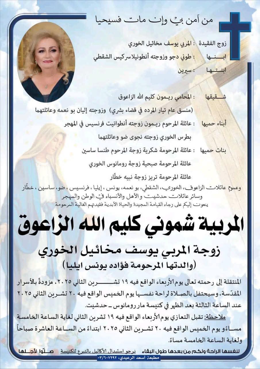 وفاة شقيقة الأستاذ ريمون الزاعوق