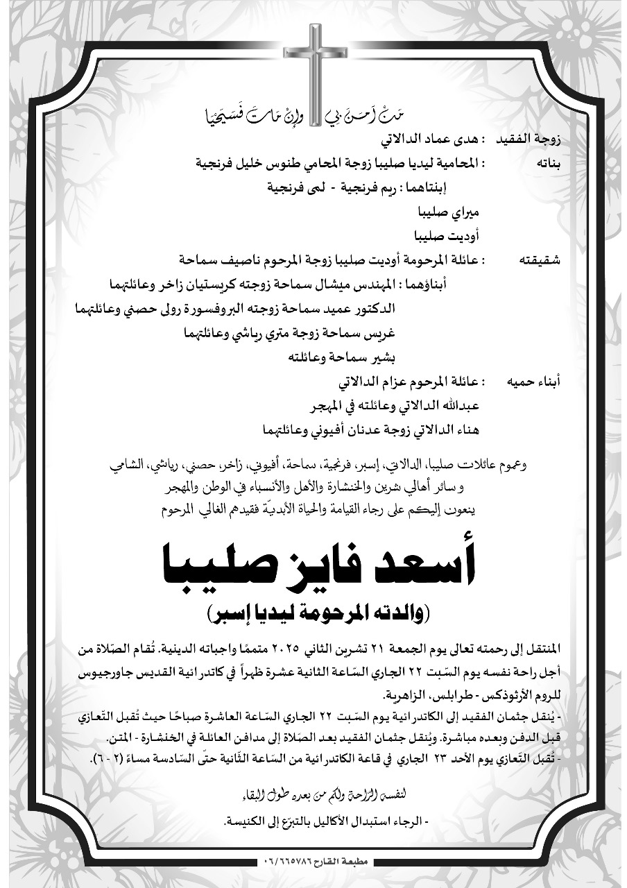 وفاة والد الأستاذة ليديا صليبا وحمو الأستاذ طنوس فرنجية