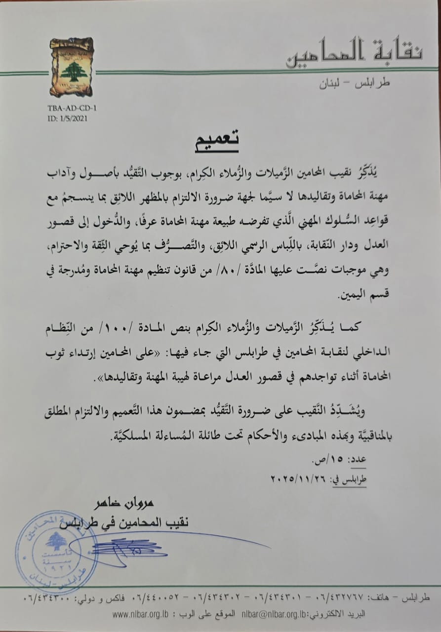 26/11/2025 يذكّر نقيب المحامين الزميلات والزملاء الكرام، بوجوب التقيّد بأصول وآداب مهنة المحاماة وتقاليدها لا سيما لجهة ضرورة الالتزام بالمظهر اللائق بما ينسجم مع قواعد السلوك المهني الذي تفرضه طبيعة مهنة المحاماة عرفا، والدخول إلى قصور العدل ودار النقابة، باللباس الرسمي اللائق، والتصرّف بما يوحي الثقة والاحترام، وهي موجبات نصت عليها المادة /80/ من قانون تنظيم مهنة المحاماة ومدرجة في قسم اليمين.