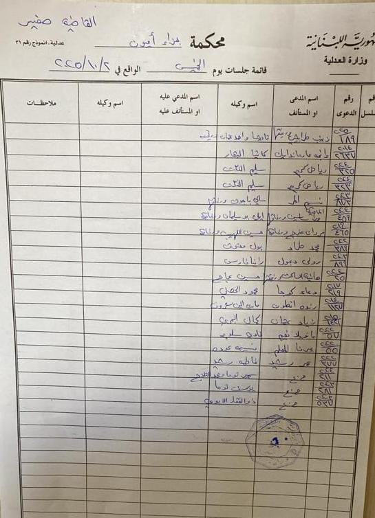 جدول جلسات محكمة عجلة طرابلس غرفة الرئيس ابي رزق ليوم غد الخميس الواقع فيه 2/10/2025