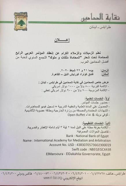 تشارك نقابة المحامين في طرابلس ممثلةً بالنقيب محمد المراد في فاعليات المؤتمر العربي الرابع للمحاماة تحت شعار " المحاماة ملكات وملوك"، التجمع السنوي لنخبة من أفضل المحامين العرب، يوما 21 و22 شباط 2020 ، وذلك في فندق كونراد كورنيش النيل - القاهرة